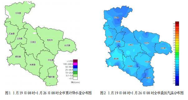 上周以晴到多云天气为主,19-21日有一轮雨雪降温天气,后期最高气温有明显回升,昼夜温差较大,全市平均气温6.2℃,最高气温为白河12.5℃(1月23日),最低气温为镇坪-5.2℃(1月22日)。