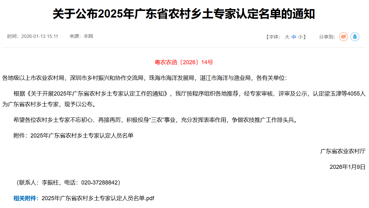 近日,广东省农业农村厅正式发布《关于公布2025年广东省农村乡土专家认定名单的通知》,阳春市黄营等41人被认定为省农村乡土专家。其中,新认定18人,复审23人。通知指出,希望各位农村乡土专家不忘初心、再接再厉,积极投身“三农”事业,充分发挥表率作用,争做农技推广工作排头兵。