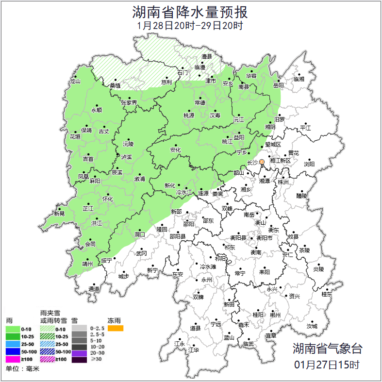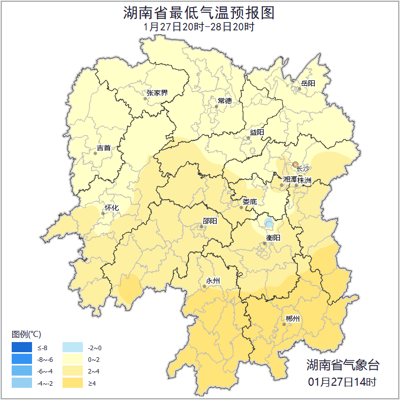 28日晚上至29日白天,湘西、湘北多云转小雨,其中张家界、常德北部局地有雨夹雪,高海拔地区有雪,其他地区多云;北风2~3级;最低气温4~7℃;最高气温湘南15~20℃,湘北5~9℃,其他地区10~14℃。