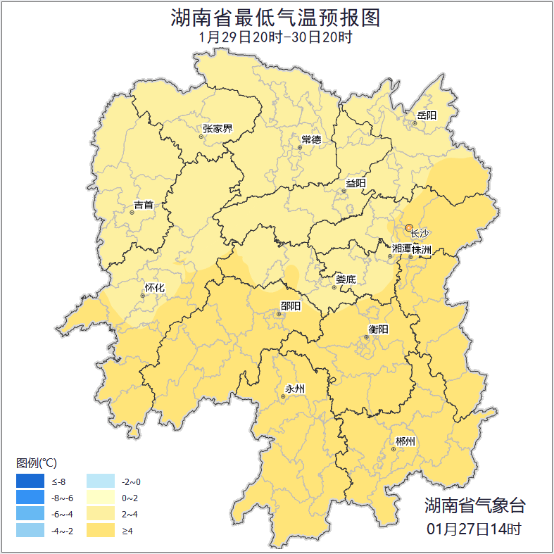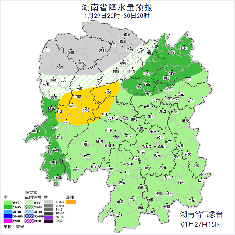 29日晚上至30日白天,湘西北阴天有雪或雨夹雪,其他地区阴天有小到中雨,其中怀化中北部、益阳西部、娄底西部局地有冻雨;北风3~4级,局地阵风6~7级;最低气温湘南5~9℃,其他地区2~4℃;最高气温湘南11~15℃,其他地区5~10℃。