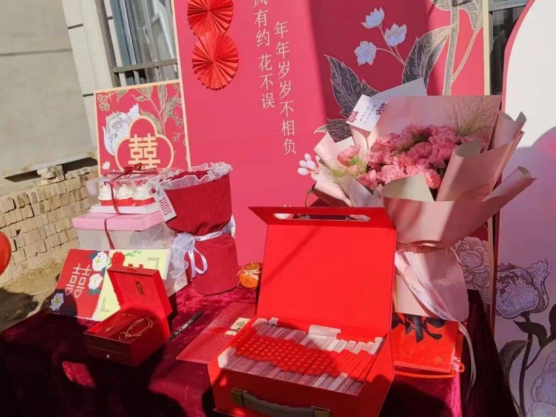 择吉日,布置场地,什么拉花、条幅、气球、礼品盒红艳艳一片,桌子上放着码得整整齐齐的几十万彩礼,鲜花、干果水果,还有黄金手镯、项链、戒指等。