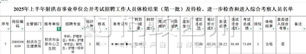 在该通告发布一个多月后,目前,调查结果尚未公布,但射洪市人力资源和社会保障局2026年1月16日发布的公告显示,在射洪市此次医疗岗位事业编考试综合成绩第一的考生税女士已经疑似“出局”,排名第二的考生邓某成为唯一递补进入体检名单的人员。