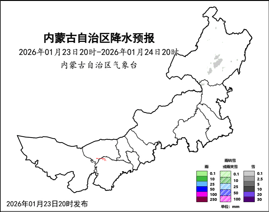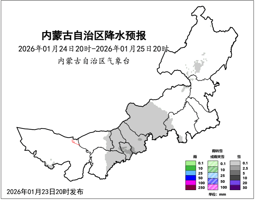 包头市东南部、呼和浩特市中部、乌兰察布市南部部分地区有中雪