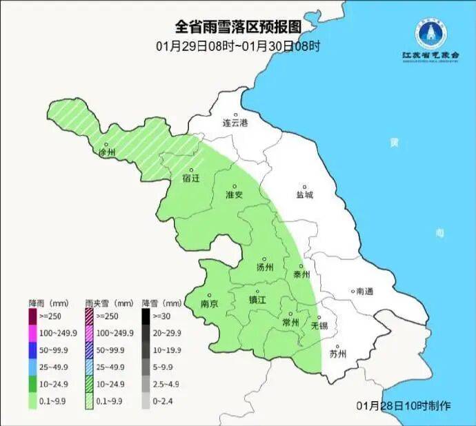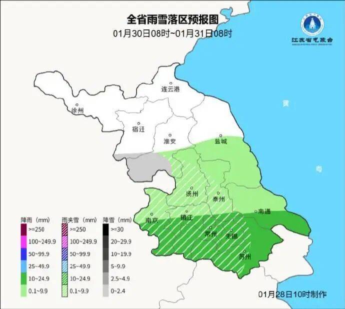 1月30日08时至1月31日08时,江淮之间地区小雨转雨夹雪或小雪,苏南地区雨转雨夹雪或雪,雨雪量中等,其他地区多云。最高温度:沿江和苏南地区7℃左右,其他地区4~5℃;最低温度:淮北地区-2~-3℃,沿江和苏南地区0~1℃,其他地区-1℃左右。全省偏东风4-5级阵风6级转东北风4级左右。