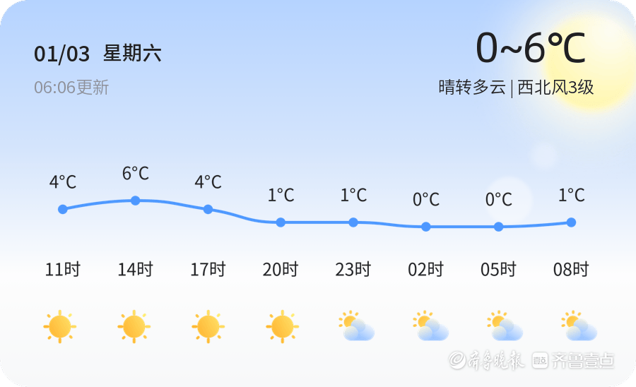 今天是1月3日(农历十一月十五),星期六,日照市天气晴转多云,气温在0℃到6℃之间。目前温度为-1.8℃,西北风3级,空气湿度49%,空气质量为良(PM2.5指数85)。今天天气晴朗,适合户外活动,但早晚温差较大,市民出行时请适时增减衣物,注意防晒保暖。
