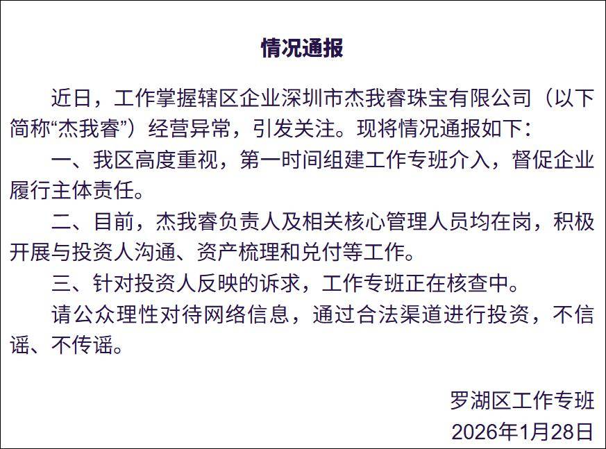 1月28日,罗湖区工作专班发布情况通报:近日,工作掌握辖区企业深圳市杰我睿珠宝有限公司(以下简称“杰我睿”)经营异常,引发关注。现将情况通报如下: