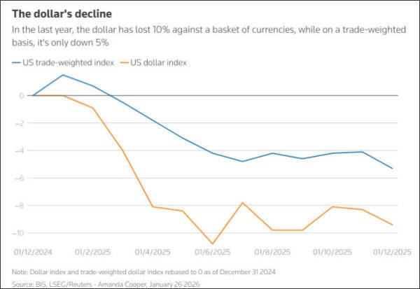 27日,美元兑一篮子主要货币创下自去年4月以来最大的三日跌幅。当时特朗普政府推出的“解放日”关税政策引发美国资产大幅抛售。