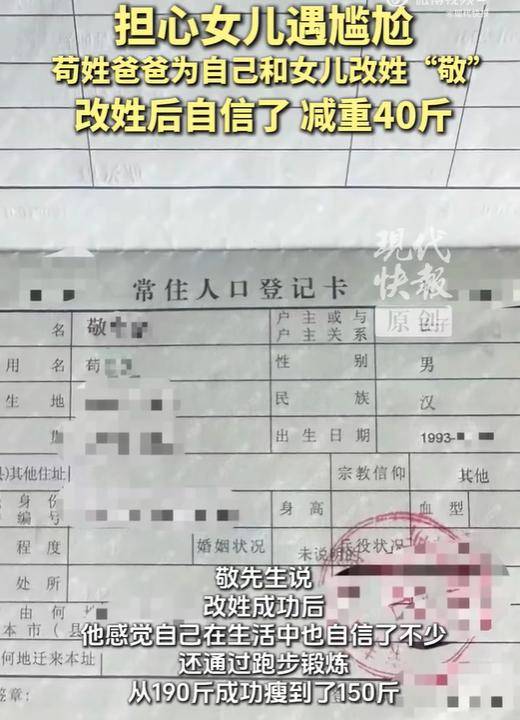 敬先生告诉记者,接到派出所电话让他去拿新身份证时,他有一瞬间的怀疑随即又激动万分,没想到困扰他30年的姓氏问题,竟然真的解决了。“经历过改姓这件事,我觉得只要肯努力,没有什么事是完成不了的。我努力改变自己,从190斤减肥成功,到了150斤。”