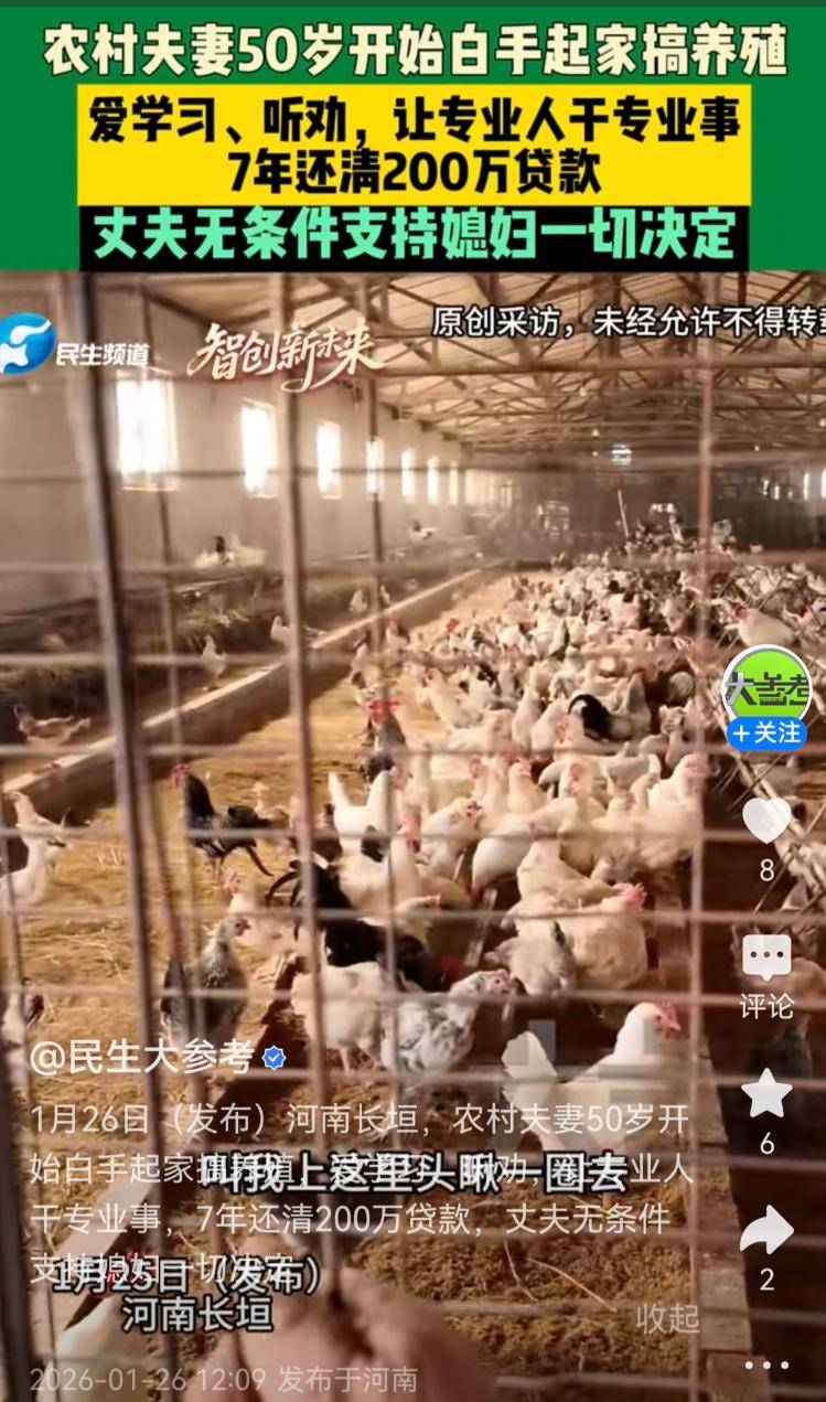 据河南广电民生大参考1月26日报道,这对河南长垣的农村养鸡夫妻,妻子名叫郭军瑞,丈夫名叫孙士学,很吃苦耐劳,50岁开始白手起家搞养殖,丈夫无偿支持妻子一切决定,贷款200万元建养鸡场,如今7年已还清了贷款,手里还有余钱。夫妻俩爱钻研,有新型职业农民培训两人都去学习,老师讲的内容都记了下来。另外,鸡生病治疗和防疫,都会交给专业人员,夫妻俩就专心搞管理。(极目新闻记者 张皓)