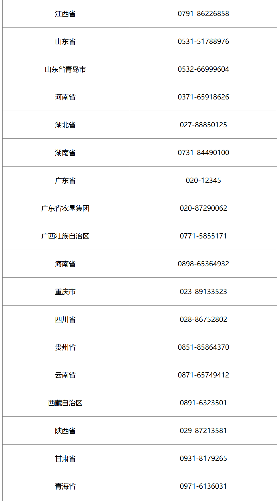 为扎实推进高标准农田建设工程质量“回头看”和专项整治行动,强化建设质量监管,畅通问题反映渠道,现将农业农村部、各省及相关地方高标准农田投诉举报电话公布如下,受理广大群众对高标准农田建设相关农田灌排设施、田间道路、电力设施等工程质量方面的问题投诉、建议和意见。