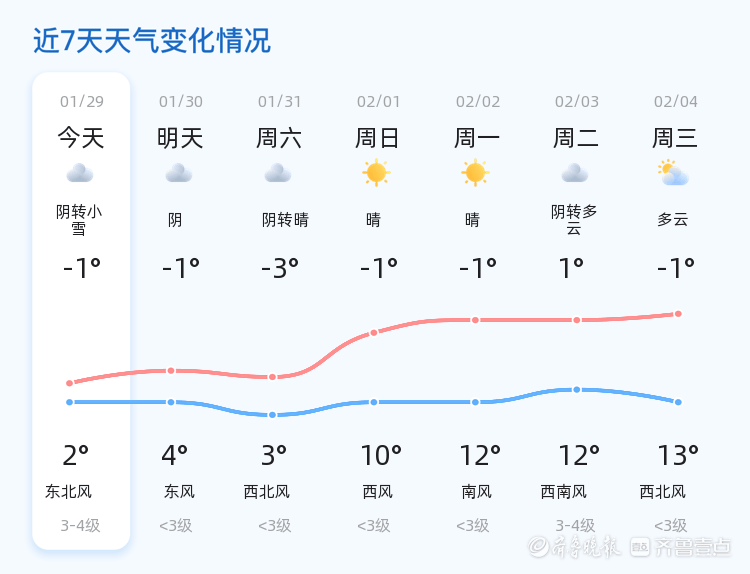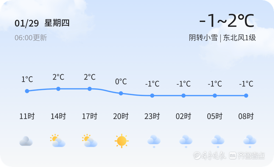 今天是1月29日,星期四,农历十二月十一。淄博市迎来新一轮降温降雪天气,今天全市大部分地区天气以阴转小雪为主,气温在-1℃至2℃之间。目前市区温度为-0.5℃,东北风1级,空气湿度83%,PM2.5指数130。各区县天气情况基本一致,均为阴转小雪,气温略有波动,但整体变化不大。