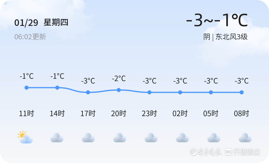 今天是2026年1月29日,农历十二月十一,星期四。烟台市今日天气阴冷,气温在-1℃至-3℃之间,东北风3级,空气湿度59%,PM2.5指数36。各区天气情况总体相似,均为阴天,气温较低。