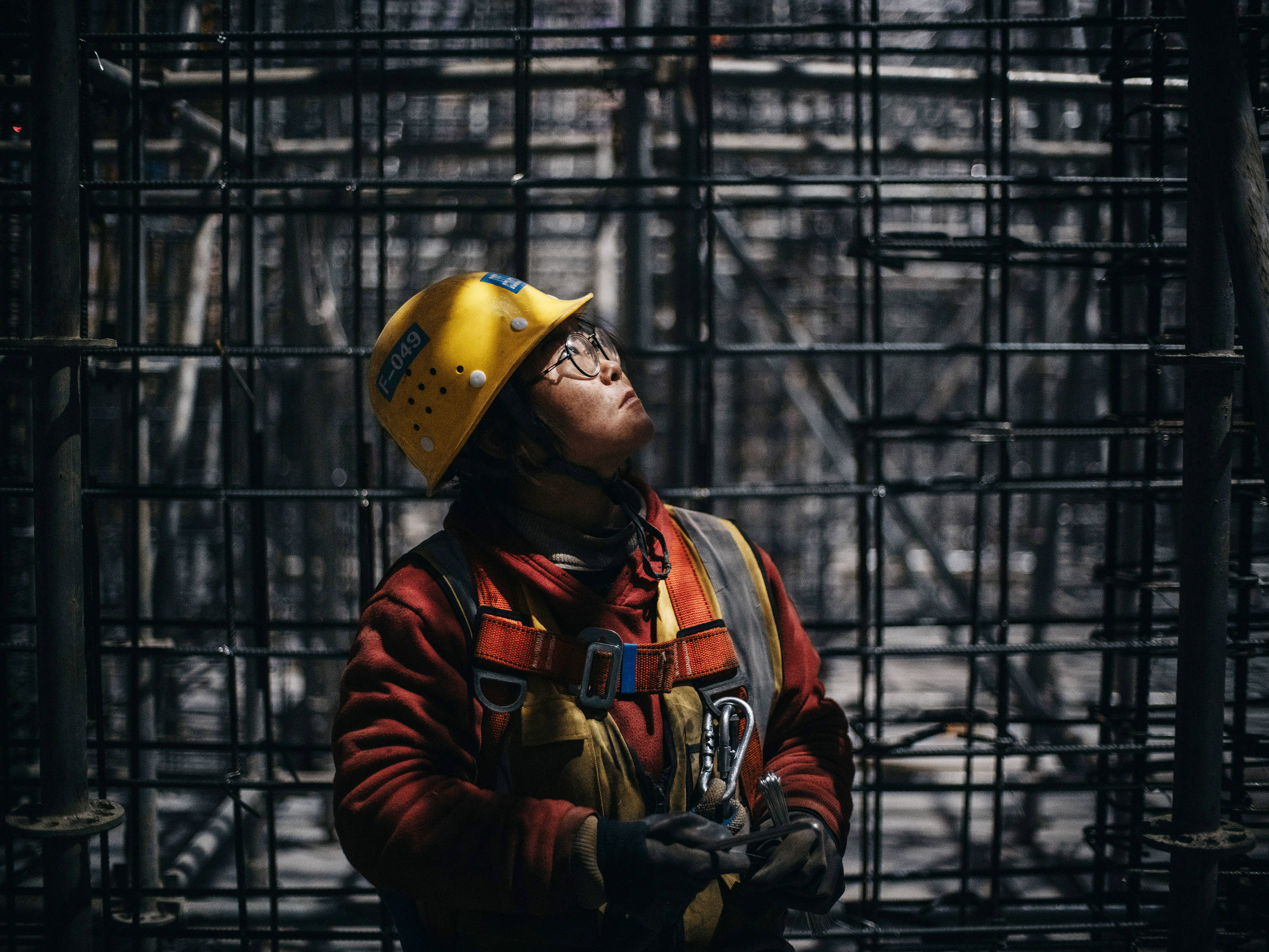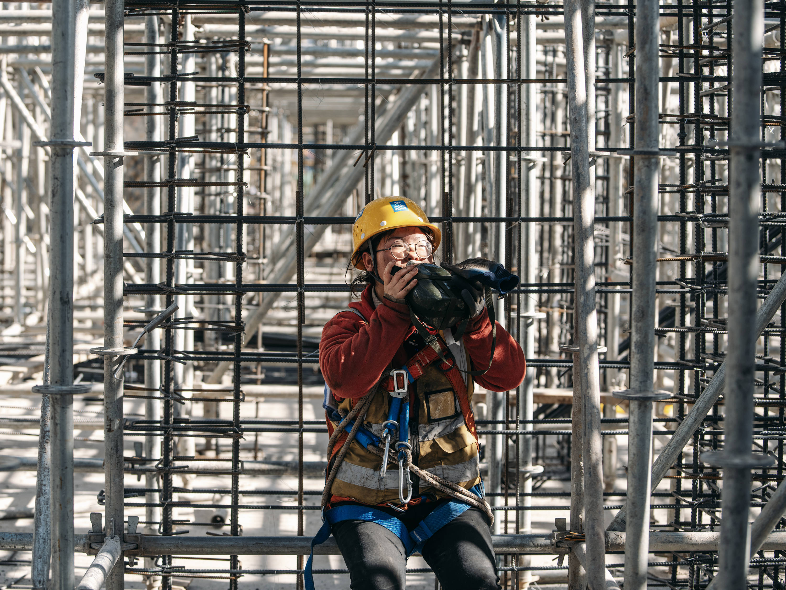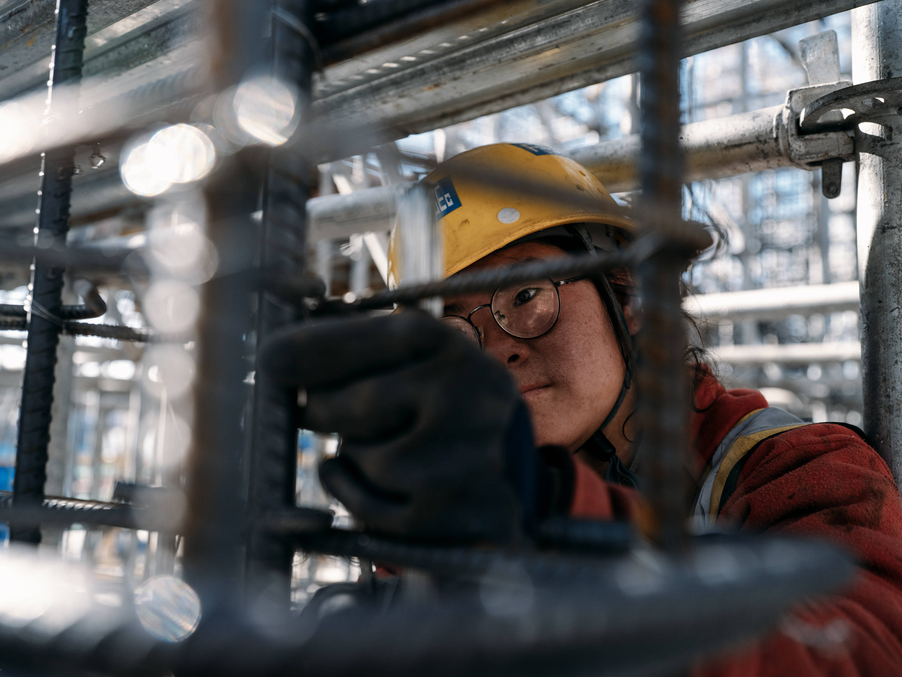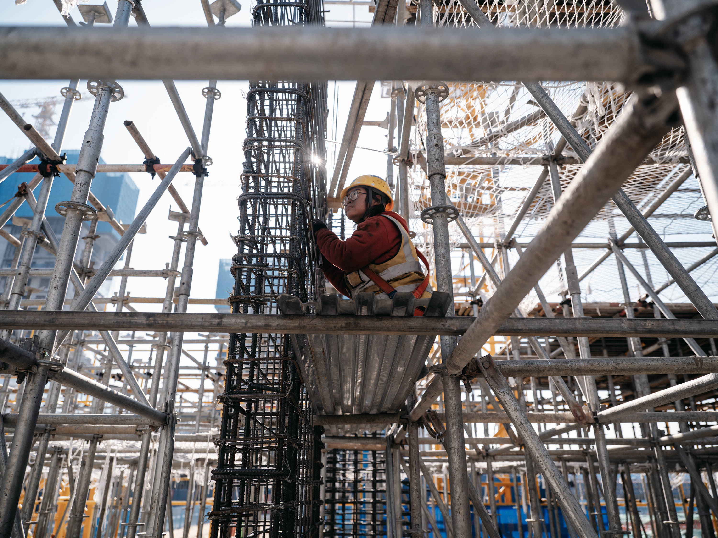 冬日清晨,西安一处尚未封顶的工地上,冷风在楼层间穿过。24岁的刘燕戴着安全帽,站在脚手架旁,一根一根绑着钢筋。她高度近视,干活时常用沾灰的手背推眼镜,脸被蹭得发黑,但手里动作很少停下来。