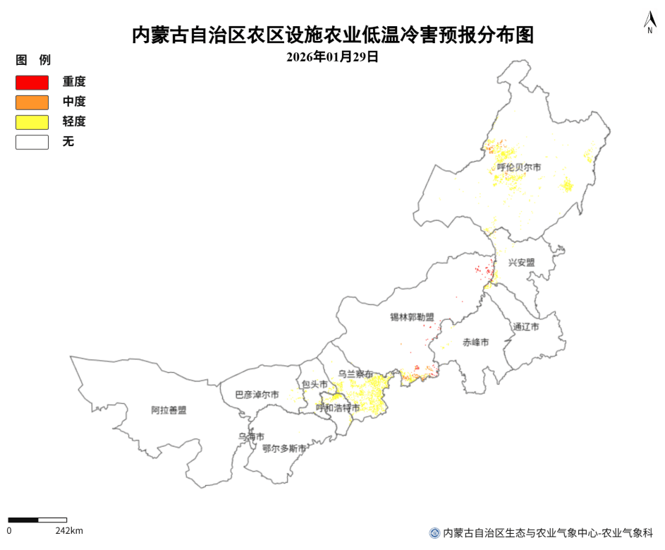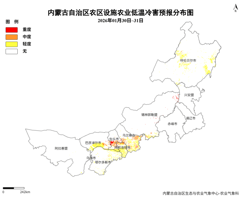 图1 1月29日至31日内蒙古地区设施农业低温冷害预报图