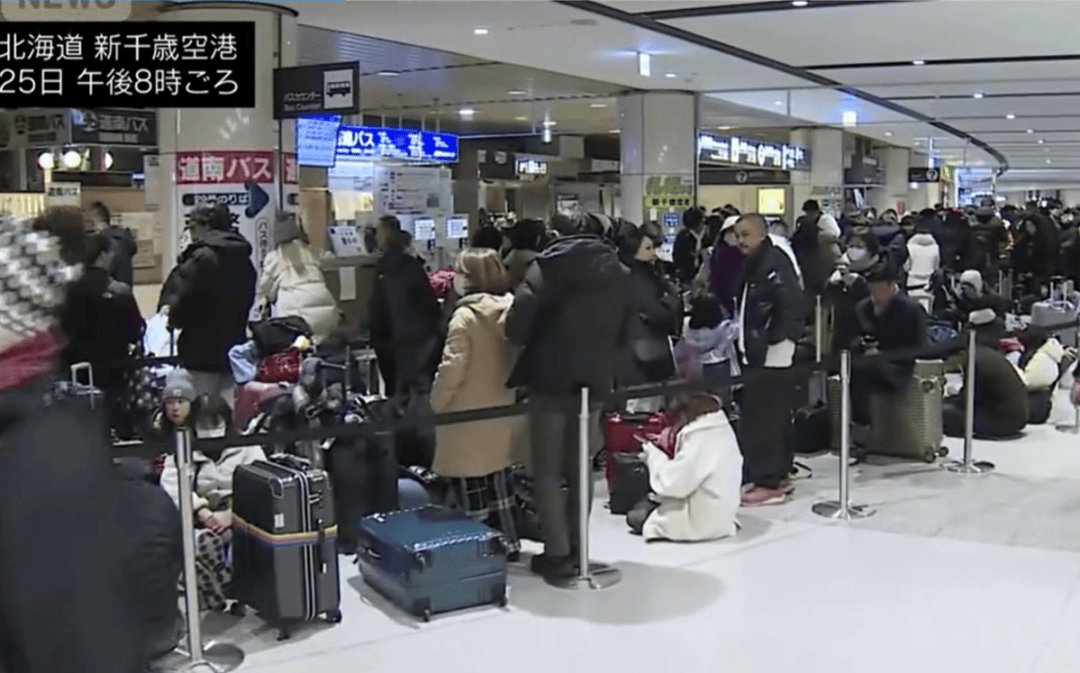 暴雪导致新千岁机场运营严重受阻。新千岁机场运营方、北海道机场股份有限公司说,25日取消56架次航班,约7000名旅客在机场内过夜。