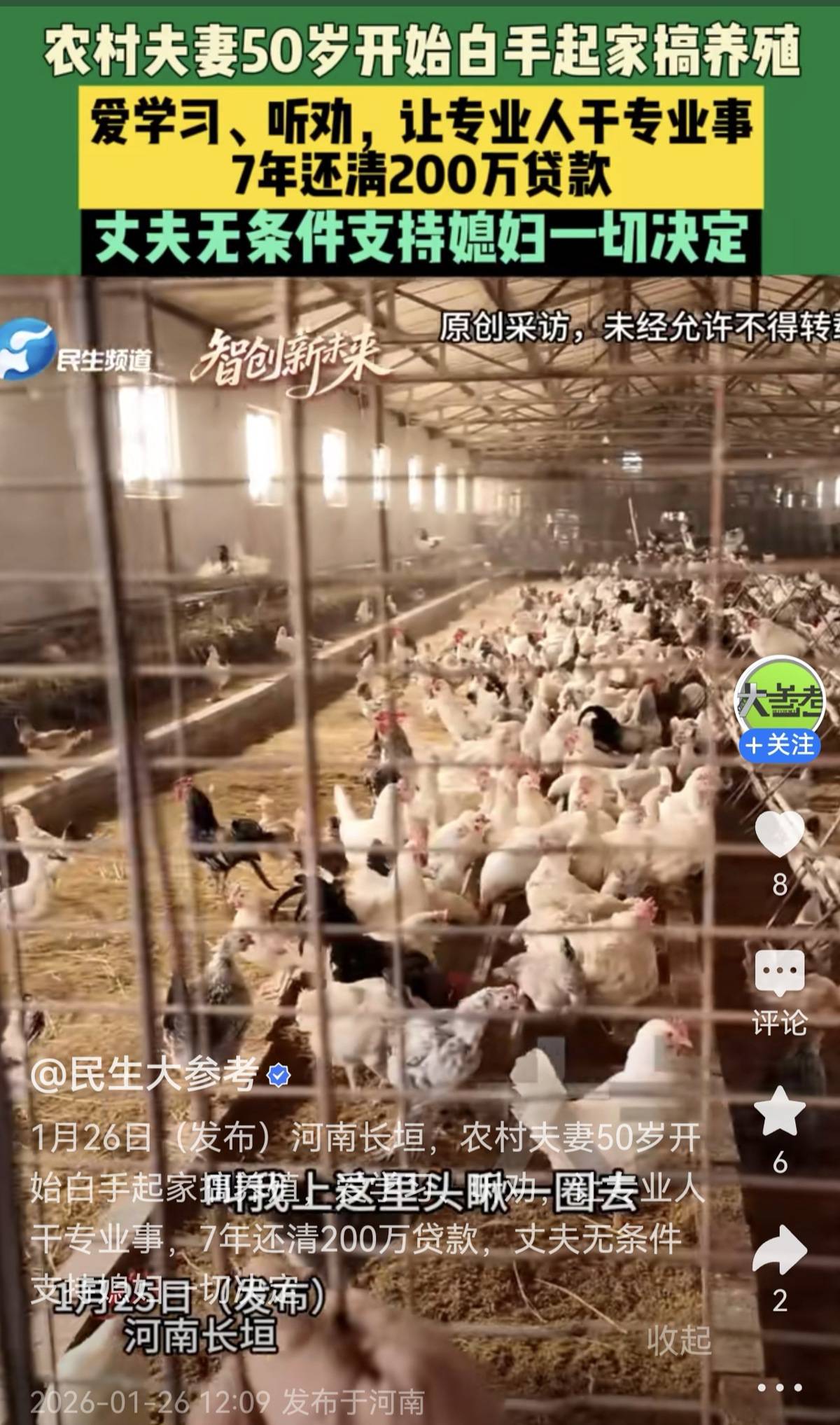 据河南广电民生大参考1月26日报道,这对河南长垣的农村养鸡夫妻,妻子名叫郭军瑞,丈夫名叫孙士学,很吃苦耐劳,50岁开始白手起家搞养殖,丈夫无偿支持妻子一切决定,贷款200万元建养鸡场,如今7年已还清了贷款,手里还有余钱。夫妻俩爱钻研,有新型职业农民培训两人都去学习,老师讲的内容都记了下来。另外,鸡生病治疗和防疫,都会交给专业人员,夫妻俩就专心搞管理。