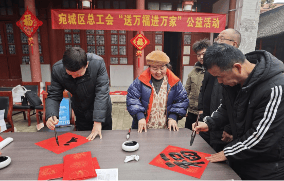 1月26日,宛城区总工会、区文联组织书法家举办的“送福进万家”公益活动在区政府小广场上开展,为广大职工群众送福送春联。