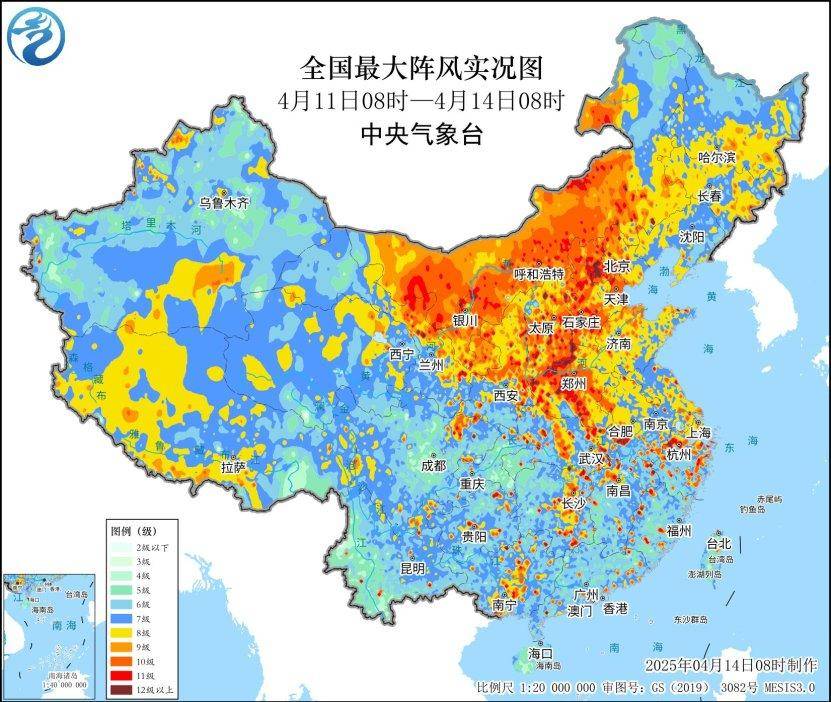 图为2025年4月11日至14日全国最大阵风实况图。图源:中国气象局