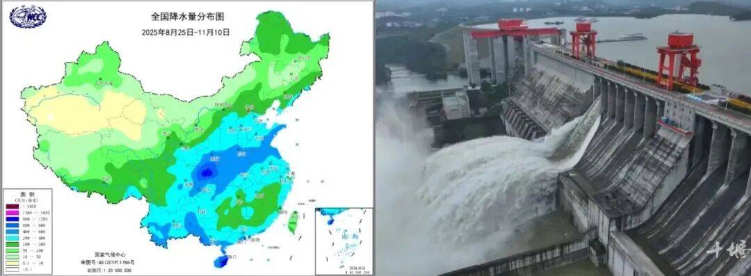 左图为2025年华西秋雨期间全国降水量分布,右图为丹江口水库开闸泄洪