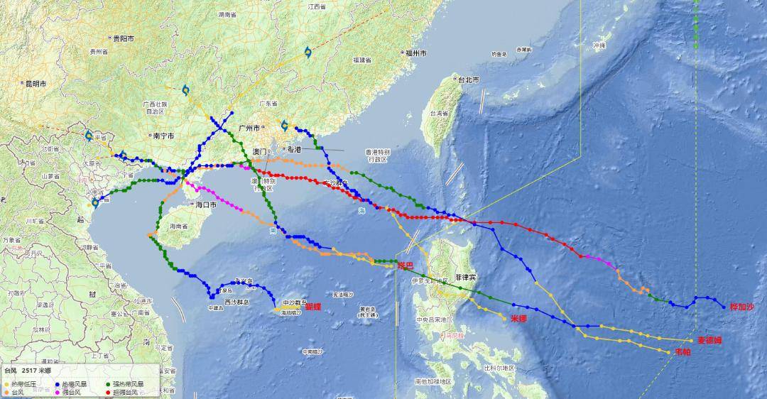 图为2025年登陆广东的6个台风移动路径。图源:中国气象局