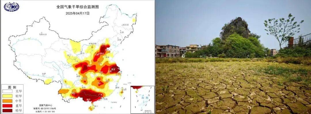 左图为2025年4月17日全国气象干旱监测图,右图为2025年4月广西桂林一处干旱开裂的水田