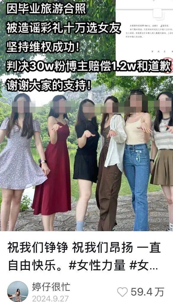 被明码标价的6位女生没有内耗,转而将造谣的博主告上法庭,1年后最终胜诉,该造谣者也被列入了失信名单。