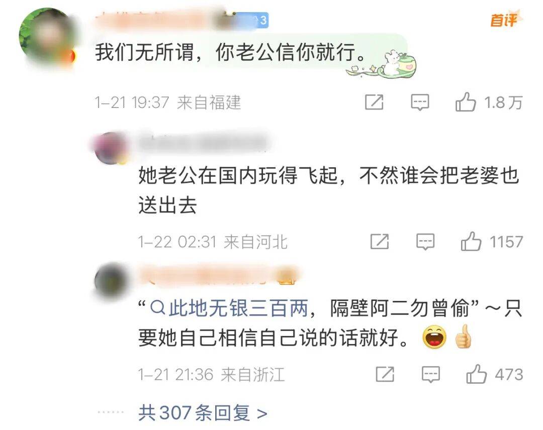 评论区如同水军般,始终重复一句“三通一达”“你只要做一个婚检证明”或是“我们信不信无所谓,你老公信就行”