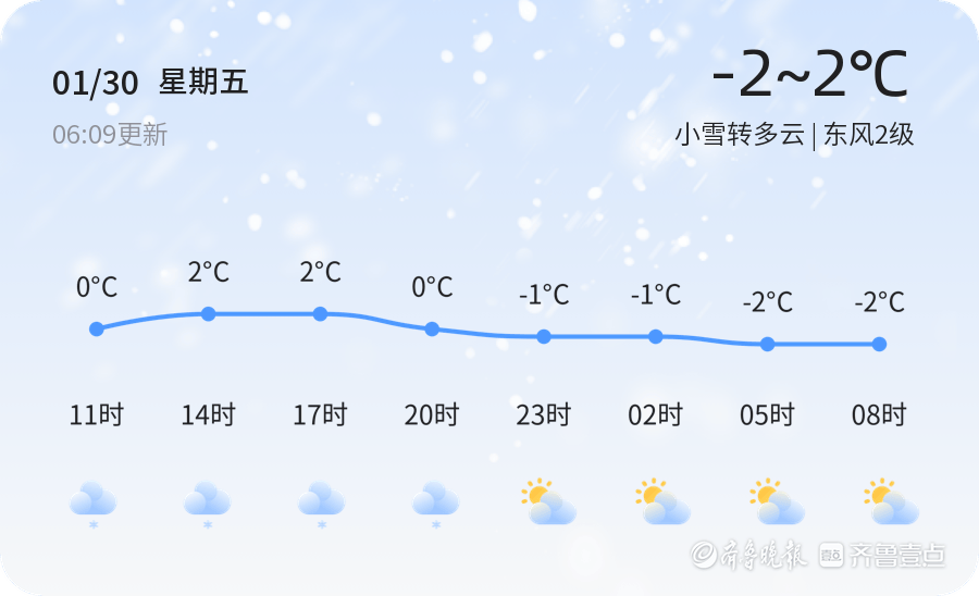 今天是2026年1月30日,农历十二月十二,星期五。德州地区迎来小雪天气,目前气温为-2.4℃,伴有东风2级,空气湿度为67%。空气质量状况良好(PM2.5为57),适合户外活动。然而,由于降雪天气,路面可能湿滑,建议市民出行时注意防滑,减速慢行,确保行车安全。