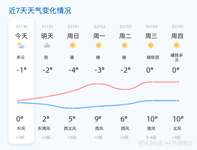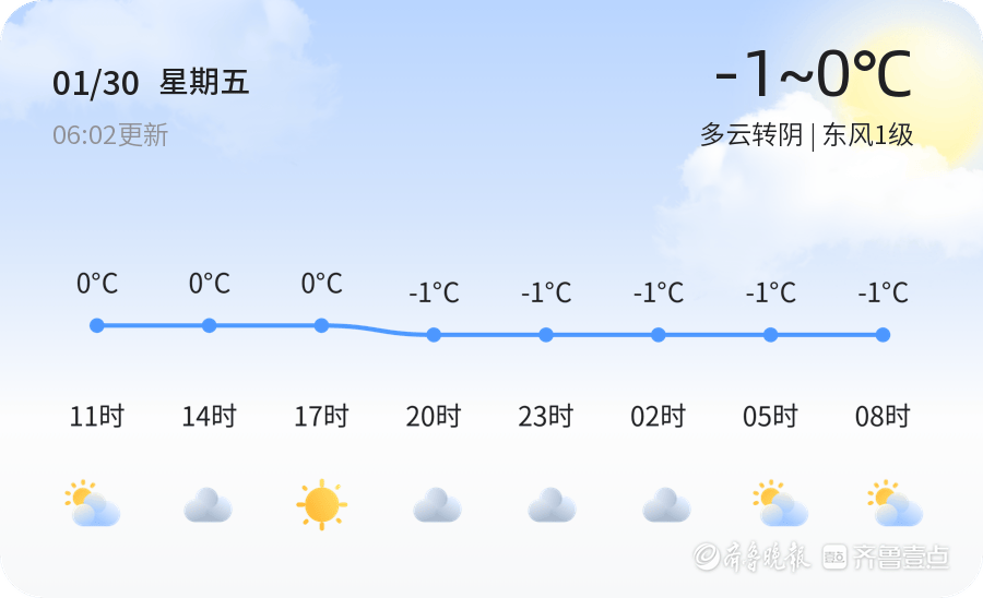 今天是2026年1月30日,星期五,农历十二月十二。东营市今日天气多云转阴,温度范围在-1℃至0℃之间,东风1级,空气湿度59%,PM2.5指数26,空气质量良好。各区天气情况基本一致,均为多云转阴,气温较低,市民出行需注意防寒保暖。