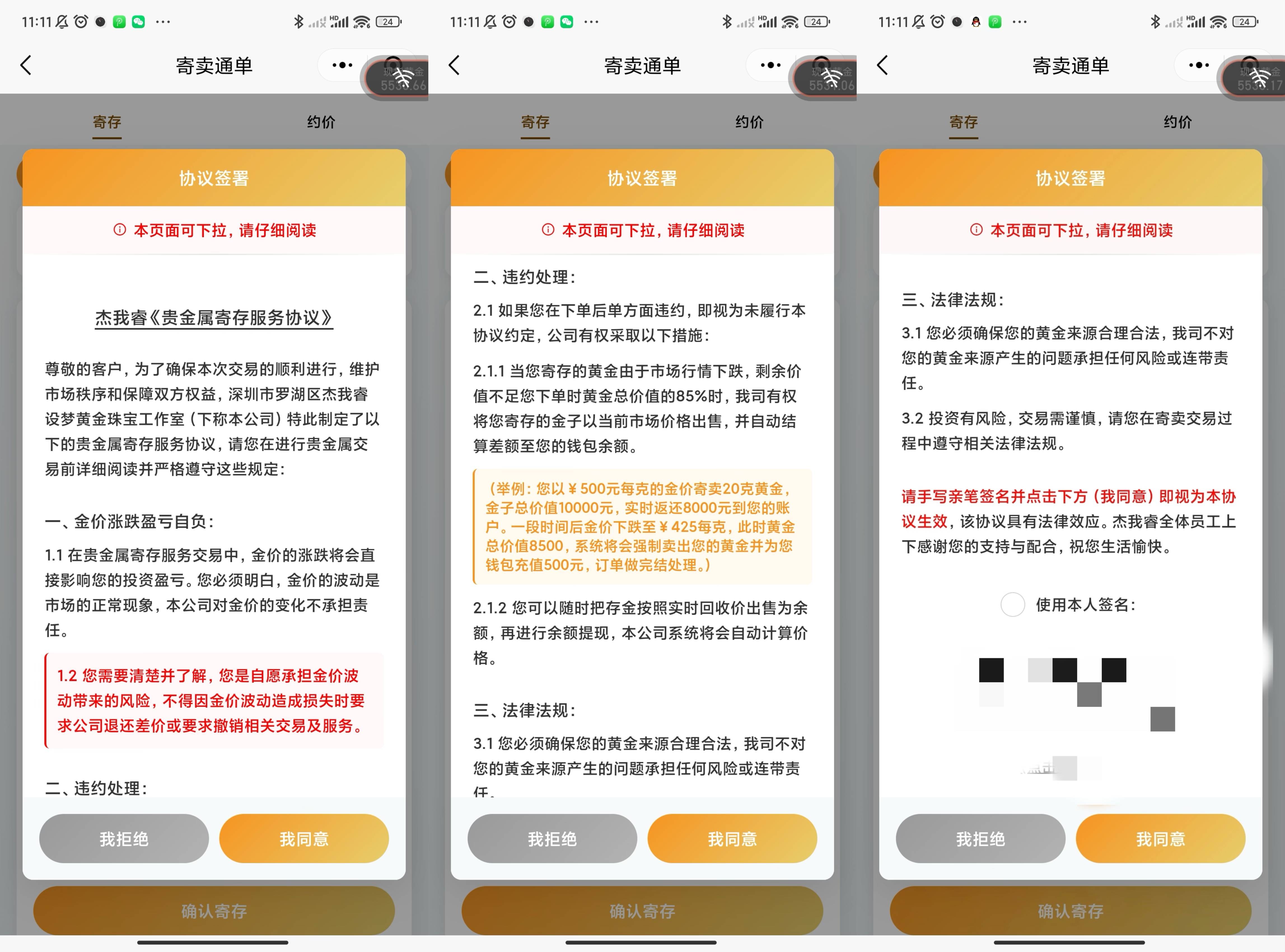 陈女士所说的“寄存”,实际上是杰我睿的“寄卖通单”业务。其中,“寄存”是“寄卖通单”的主要业务之一。根据杰我睿《贵金属寄存服务协议》,消费者寄存时按实时回收价出售,并只能拿到80%的款项。而消费者可以决定何时以市场价出售或按照寄存时的回收价赎回。但若黄金价格不足下单时总价值的85%,杰我睿将强制平仓。这单业务结束时,结余资金将返还给消费者。