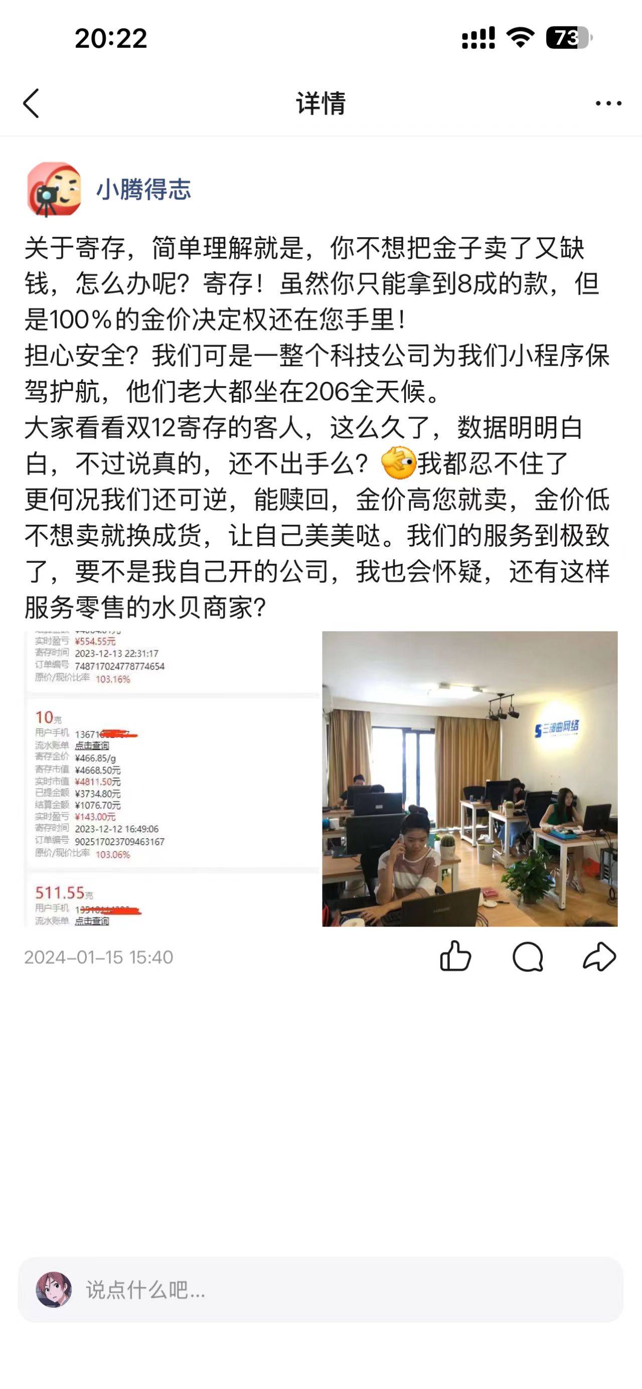 杰我睿负责人张志腾曾在微信推广时表示,“虽然你只能拿到八成款,但是100%的金价决定权还在你手中”。