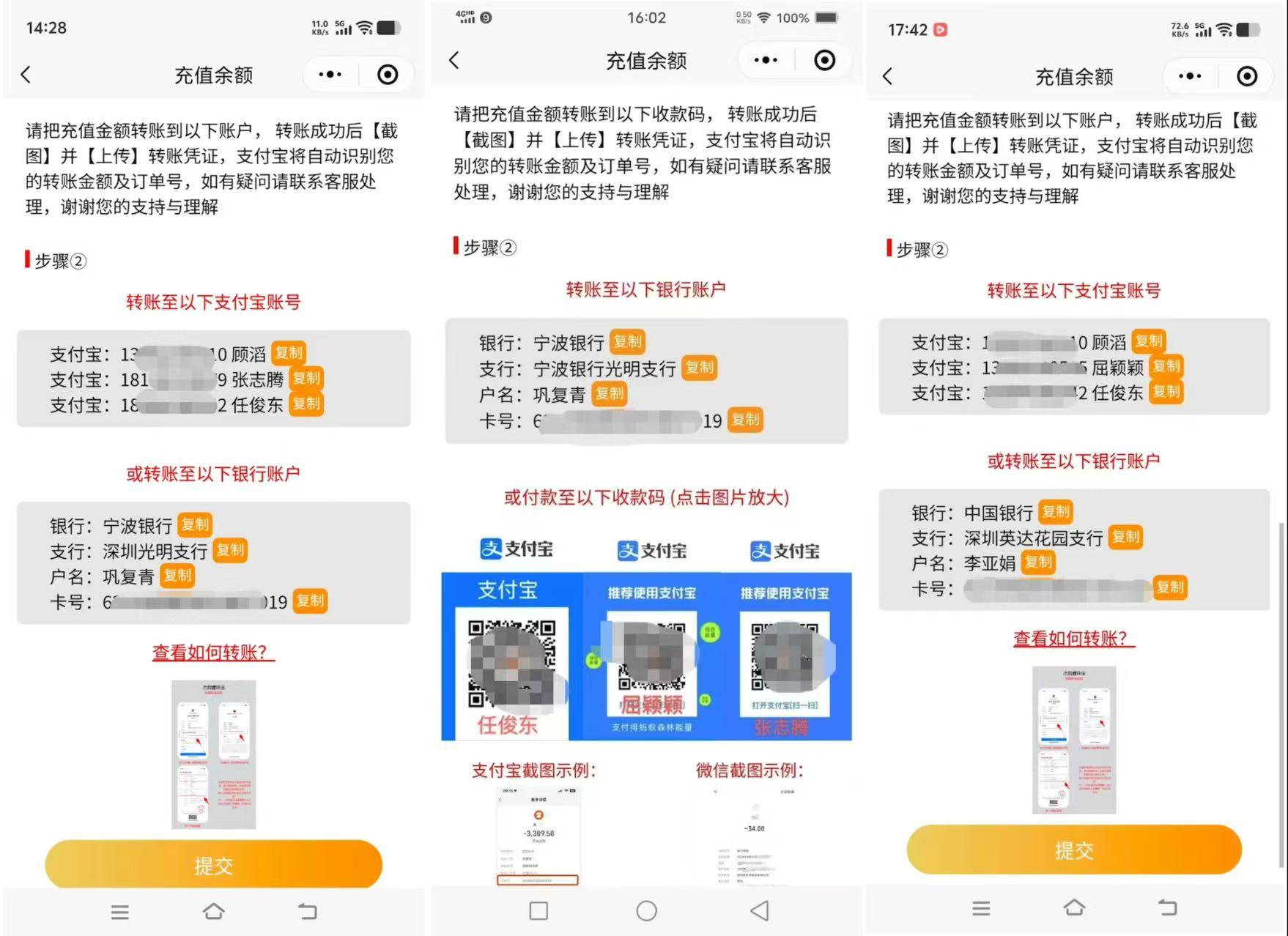 多位消费者均向贝壳财经记者提供了此前杰我睿官方发布的“充值余额”的操作流程截图,相关截图显示,杰我睿充值的支付宝账号包括顾滔、张志腾、任俊东、屈颖颖等人,同时提供的多个银行账号亦为个人账户,包括巩复青、李亚娟等。
