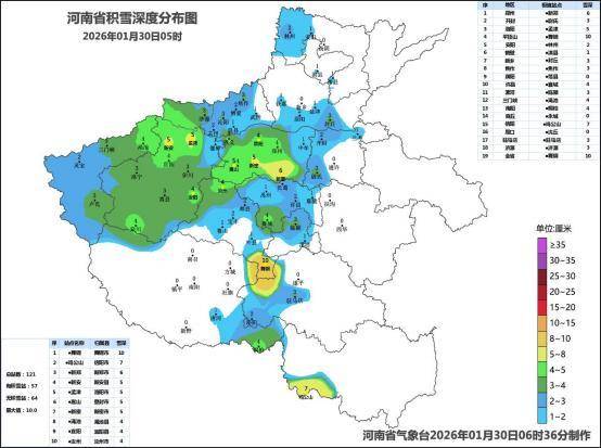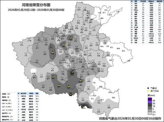 河南省气象台监测显示,1月29日12时至30日7时,河南省大部出现小到中雪,局部大到暴雪,南部出现雨或雨夹雪转雪,嵩山、鸡公山出现冻雨。全省平均降雪量2.2毫米,地市平均降雪量位列前三的分别为:郑州4.2毫米、洛阳4.0毫米、平顶山3.8毫米,降雪量位列前三位的分别为:鸡公山11.6毫米、舞钢10.1毫米、桐柏10.0毫米。降水量位列前三位的分别为:息县16.3毫米、新县16.0毫米、光山14.6毫米。截至30日5时,我省中西部、西北部、南部有3到7厘米积雪,其中平顶山局部10厘米。
