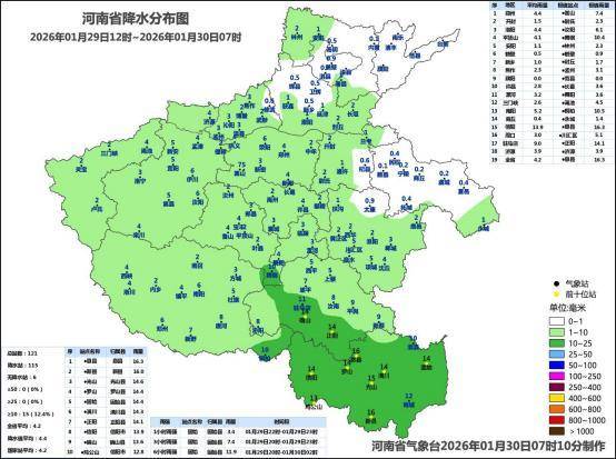 1月29日12时至1月30日7时河南省降水量分布图