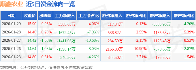 证券之星消息,截至2026年1月29日收盘,顺鑫农业(000860)报收于15.9元,上涨9.96%,换手率7.76%,成交量57.54万手,成交额8.78亿元。