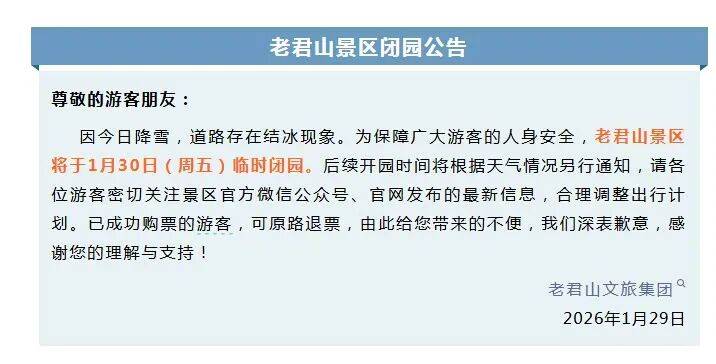 由于天气原因,自2026年1月30日9时起,景区临时关闭,恢复开放时间将根据天气情况及安全隐患排查结果另行通知。