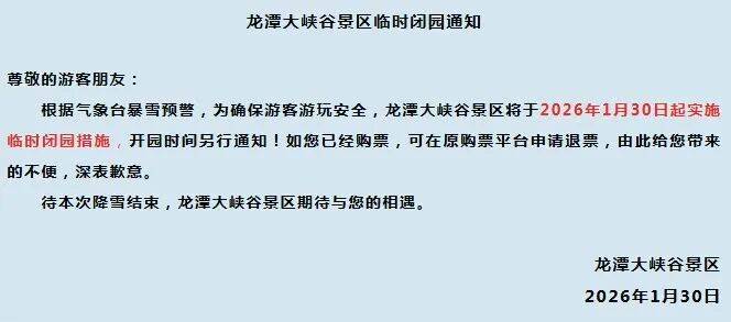根据气象台暴雪预警,为确保游客游玩安全,龙潭大峡谷景区于2026年1月30日起实施临时闭园措施,开园时间另行通知。