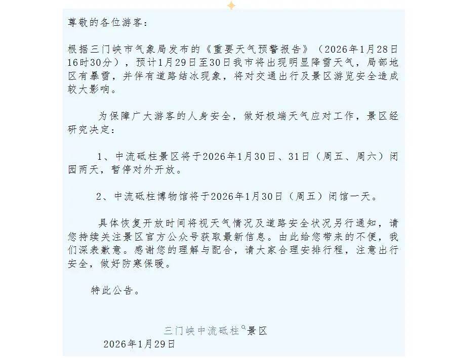中流砥柱景区于2026年1月30日、31日(周五、周六)闭园两天,暂停对外开放。