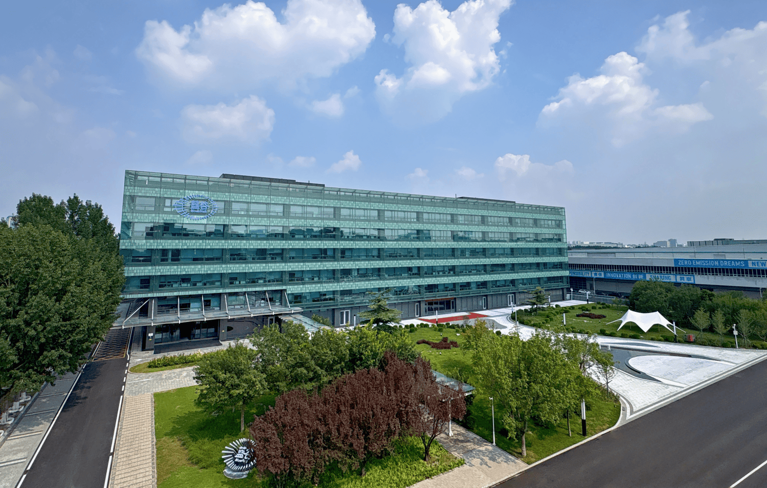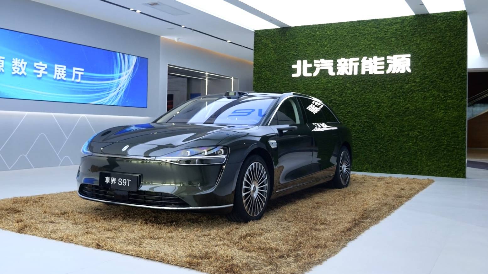 经过一块篆刻着“行有道 达天下”字样的大石,从全新的西大门走进大楼,迎面而来的不是传统风格的厚重前台,而是一面印着“北汽新能源”的绿色永生苔藓墙和一台仙踪绿的享界S9T。大厅的左右两侧,是刚刚落成的品牌和技术展厅,过道内摆放着享界S9、极狐T1等新车型,一派崭新气象。