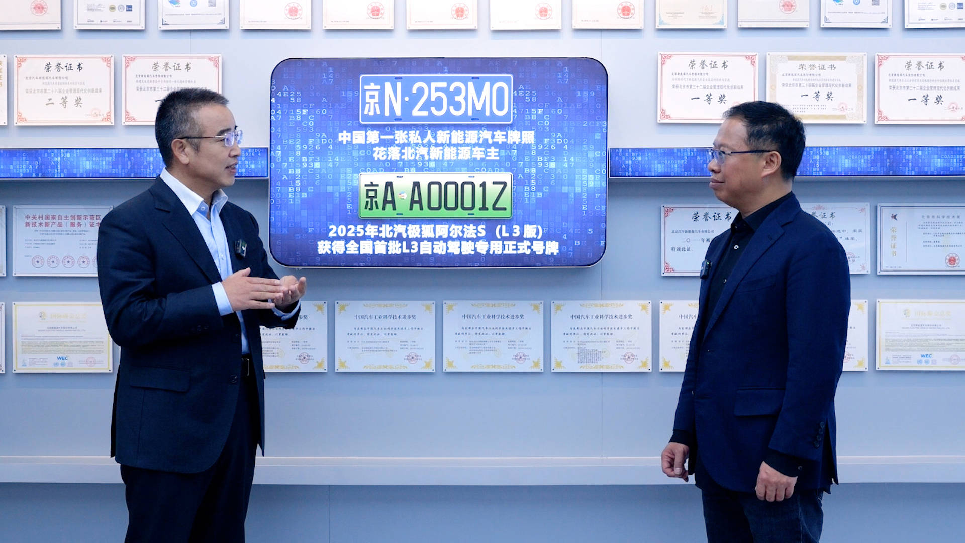 这是北京的第一张自动驾驶牌照,“Z”就是自动驾驶,我们是第一批获得工信部L3级自动驾驶牌照的,现在已经有30辆车开始运营了。还有一张牌照“京AA0733Z”,呼应了北汽蓝谷的股票代码“600733”的后三位数。