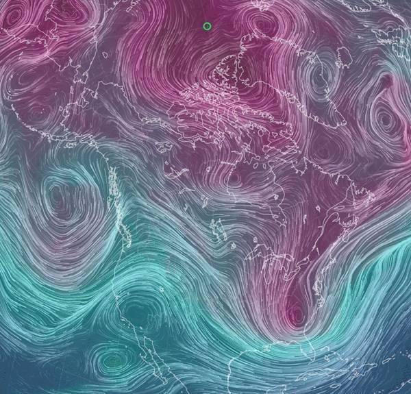 2月1日500百帕风场和气温图,上部绿圈为北极点附近,右下角的极涡都快压到佛罗里达了。(图片来源:earth)