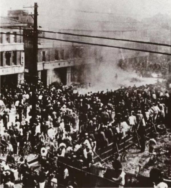 1947年2月28日,愤怒的台北民众聚集在台北烟草专卖局前面抗议,并烧毁大量物品。
