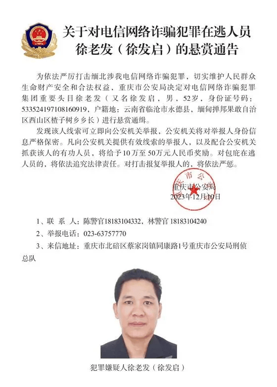 2023年9月,公安部部署重庆公安机关对缅北果敢徐老发犯罪集团开展专案侦办。同年12月,在掌握徐老发犯罪集团大量违法犯罪事实和证据的基础上,公安机关依法对徐老发公开悬赏通缉。