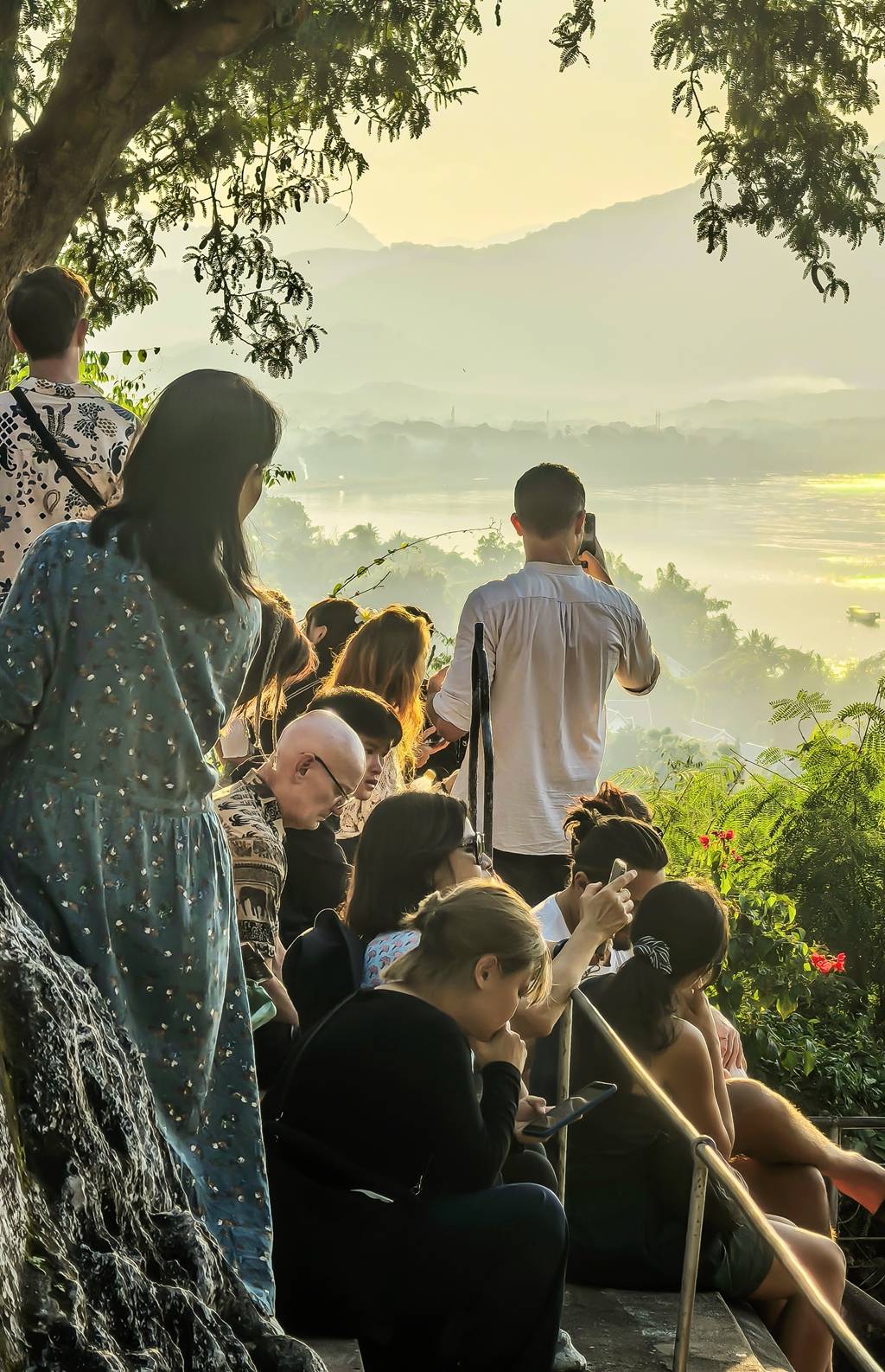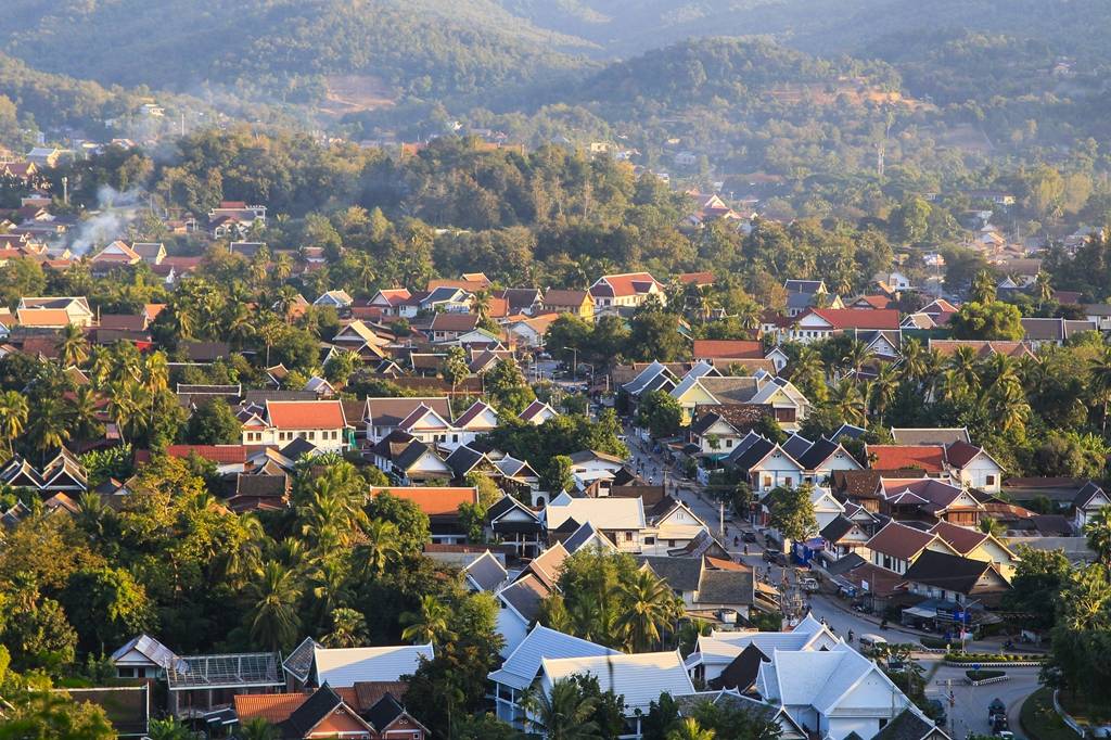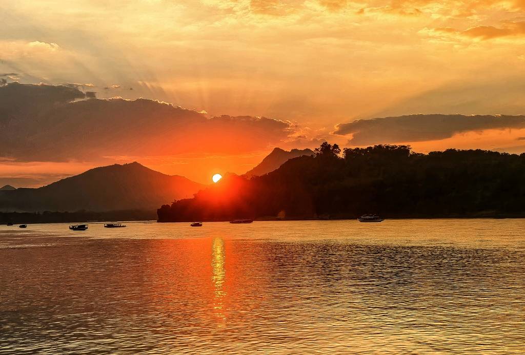 攀至山顶,天地豁然开朗。琅勃拉邦的轮廓在眼底铺展,红瓦金塔错落于蓊郁绿林,炊烟袅袅,与山岚相融。山脚下的湄公河,被夕阳染作琥珀色,波光粼粼,如佛前的琉璃盏,盛着一河的碎金。河水缓缓流淌,温柔地环抱古城,似在诉说着千年的故事。