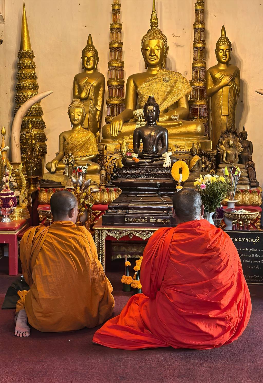曲径蜿蜒处,苔痕上阶绿。沿途佛像隐于浓荫翠影间,眉眼含笑,似在与山风低语,与岁月言和。偶有飞檐翘角自林间探出,鎏金瓦当在光影里流转,与身着紫黄僧袍的身影相映。僧侣们缓步而过,衣袂轻扬,不惹尘埃,恍若从千年时光里走来,步履间,皆是禅意。