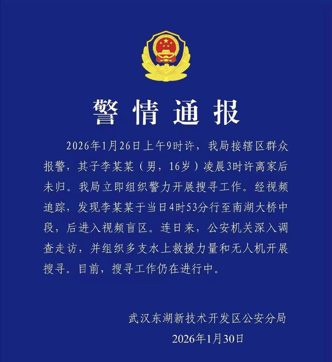 当日,武汉市公安局东新分局发布的警情通报显示,经视频追踪,发现李某某于当日4时53分行至南湖大桥中段,后进入视频盲区。连日来,公安机关深入调查走访,并组织多支水上救援力量和无人机开展搜寻。目前,搜寻工作仍在进行中。