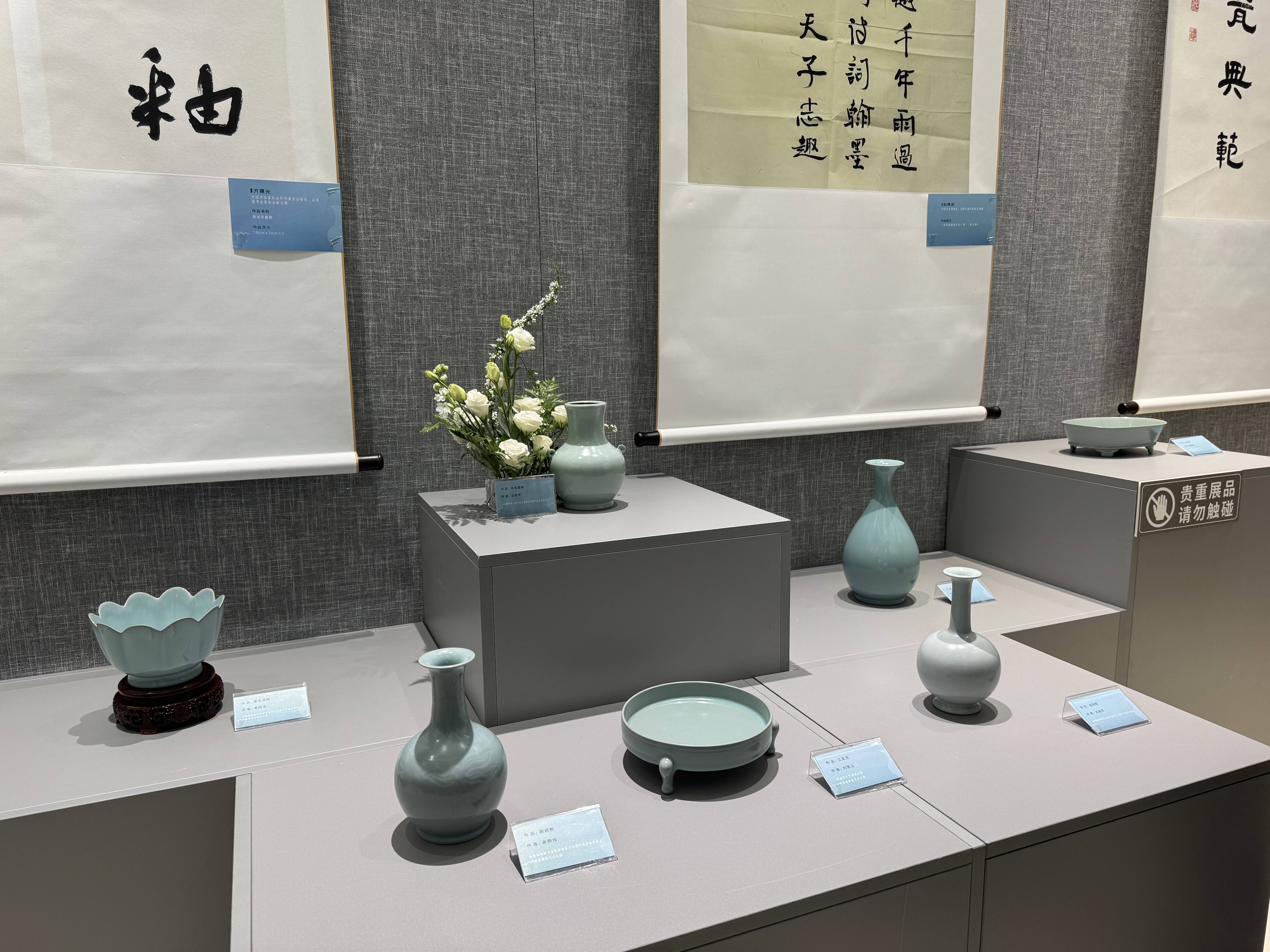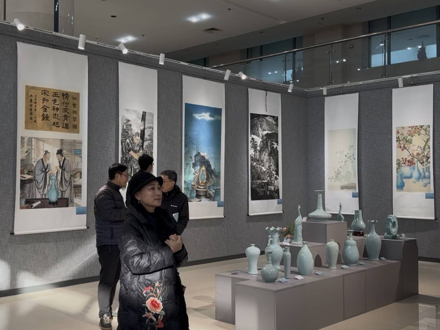 展厅内嘉宾云集、气氛热烈,观众或驻足细品汝瓷的天青釉色,或凝神欣赏书画的笔墨意境,感受着千年窑火传承不息的魅力。