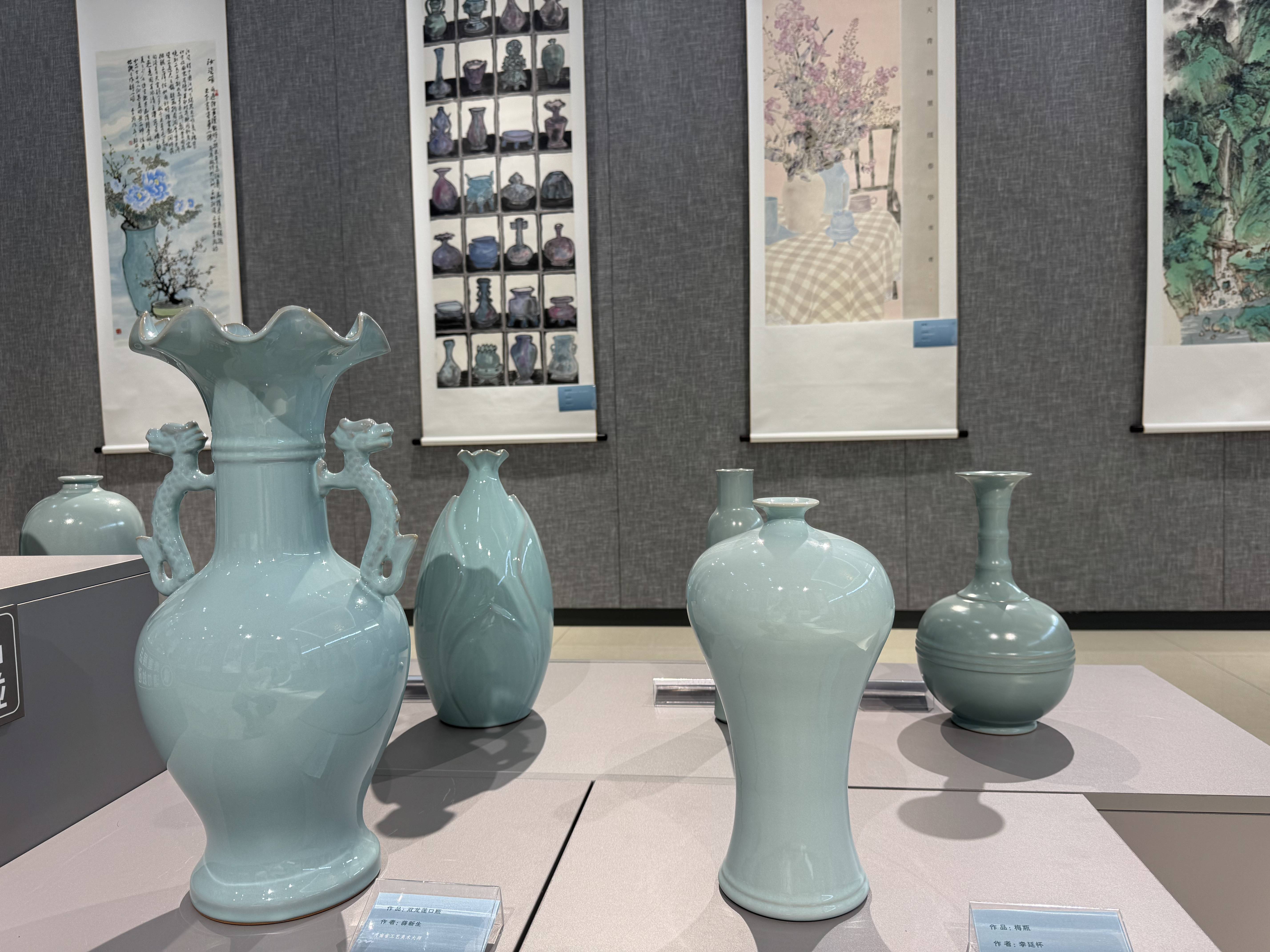 “汝窑推崇”篇章汇集13件名家墨宝,以书法艺术凝练展现汝窑之美;“翰墨丹青”篇章展出97件全国书画名家作品,涵盖书法63件、绘画34件,作品或工笔细腻,或写意洒脱,生动诠释汝窑的天青雅韵;“瓷花绽放”篇章集中展示近300件由国家级、省级陶瓷艺术大师、工艺美术大师及非遗传承人创作的汝瓷精品。这些作品既传承汝窑“青如天、面如玉、蝉翼纹、晨星稀”的特征,又融入当代审美与创新技艺,展现汝窑在当代的生机与活力。