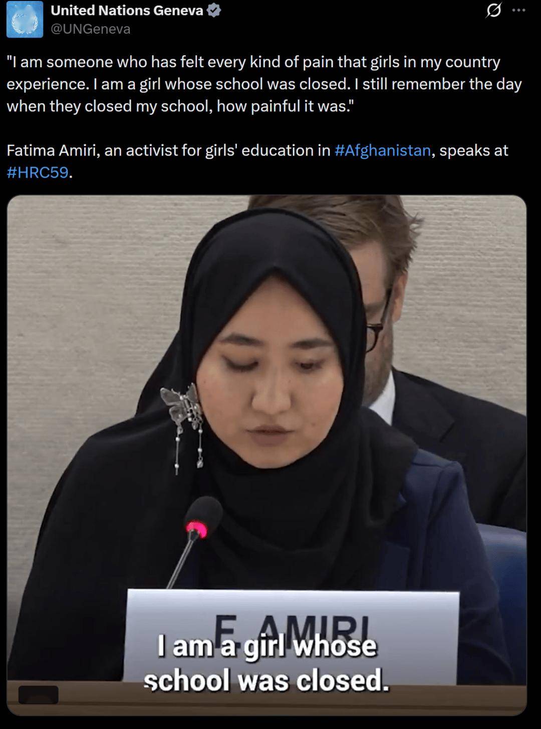 联合国日内瓦办事处去年采访到身在国外的女孩法蒂玛·阿米里。阿米里在2022年的一场自杀式炸弹袭击中身受重伤,终身残疾,失去了一只眼睛和耳朵。