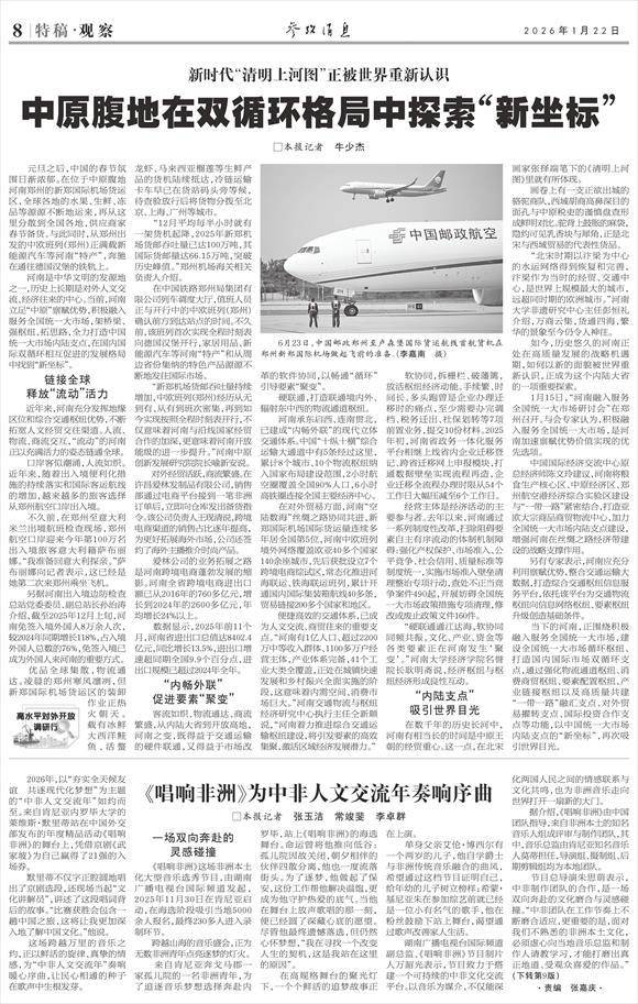 元旦之后,中国的春节氛围日渐浓郁。在位于中原腹地河南郑州的新郑国际机场货运区,全球各地的水果、生鲜、冻品等源源不断地运来,再从这里分散到全国各地,供应商家春节备货。与此同时,从郑州出发的中欧班列(郑州)正满载新能源汽车等河南“特产”,奔驰在通往德国汉堡的铁轨上。
